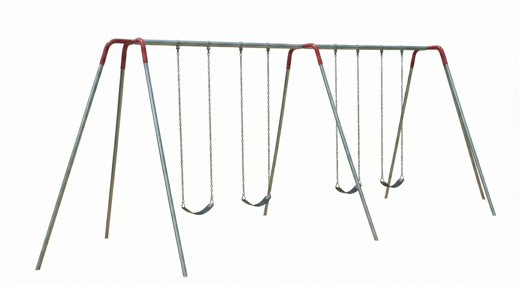 Tripod frame swing design for lower elementary to young adult. Great for neighborhoods, playgrounds, or even backyard fun for all. Swings cement into the ground. Includes all swing set parts needed swings and hardware. This metal swing set comes in a variety of sizes with 2 swings, 4 swings, 6 swings or 8 swings.