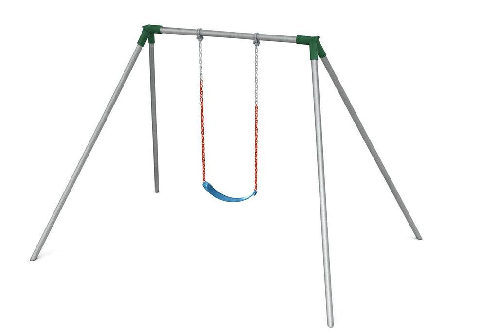 - One Bay/One Swing Commercial Grade: The legs are 150” apart lengthwise at ground level. The legs are 93” wide at ground level. Below ground, the legs are 165” lengthwise and the width below ground is 115”. Height is 8’