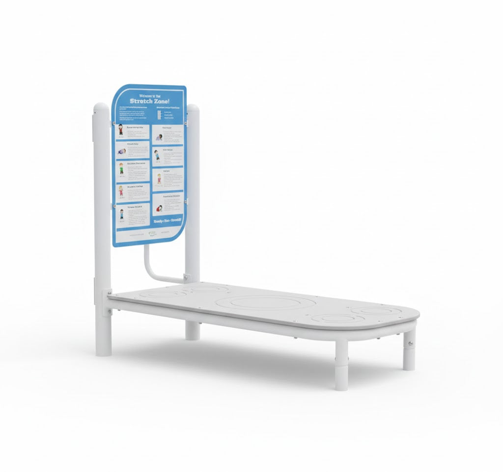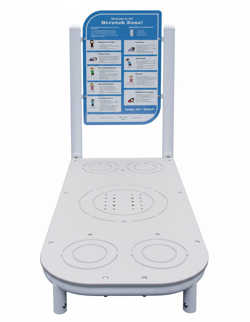 - Double-Sided Structure: The Stretch Zone is a double-sided structure. One side features a platform with placement zones, and the reverse side includes just a handrail so that users in mobility devices can stretch while remaining seated.